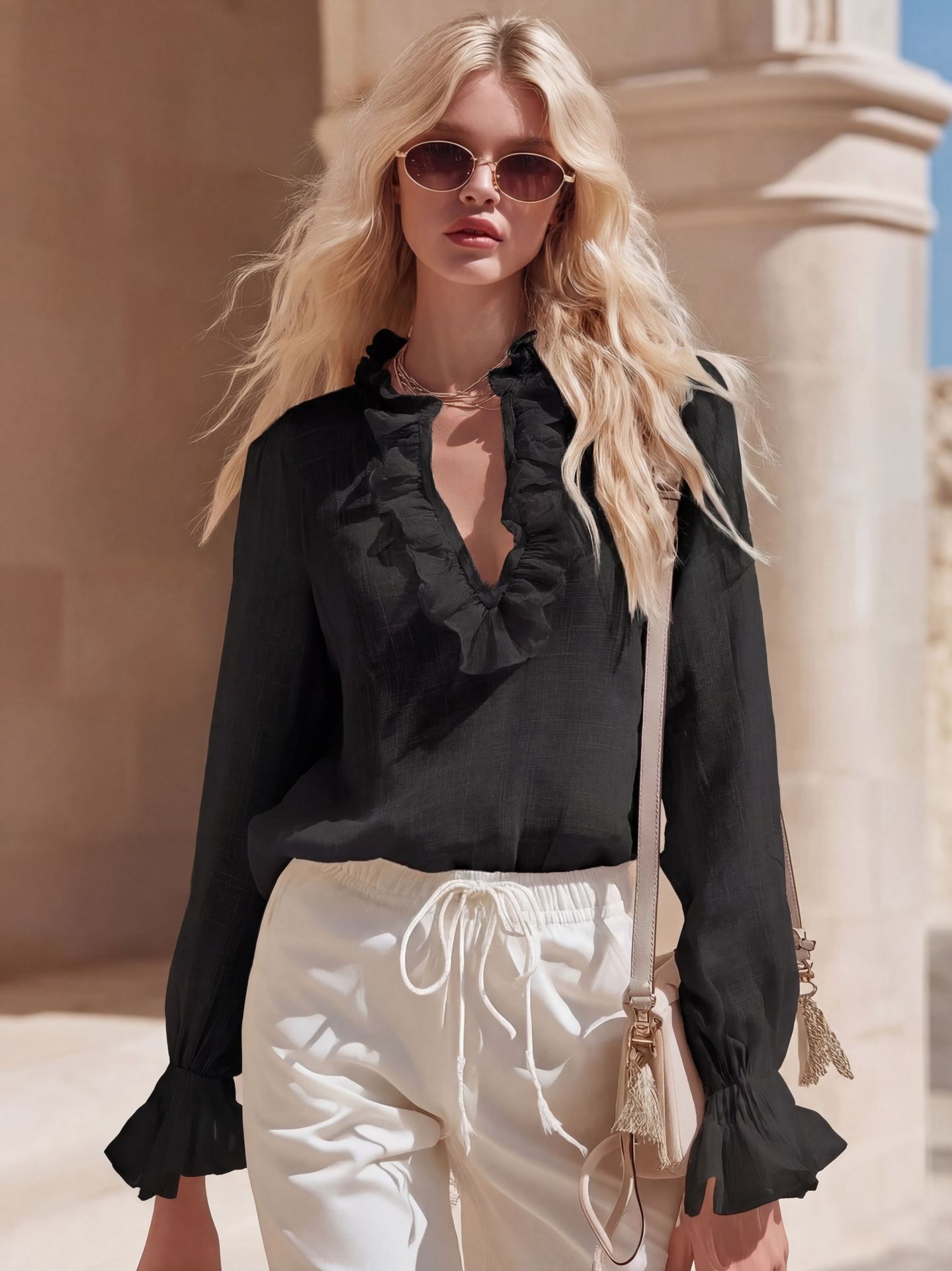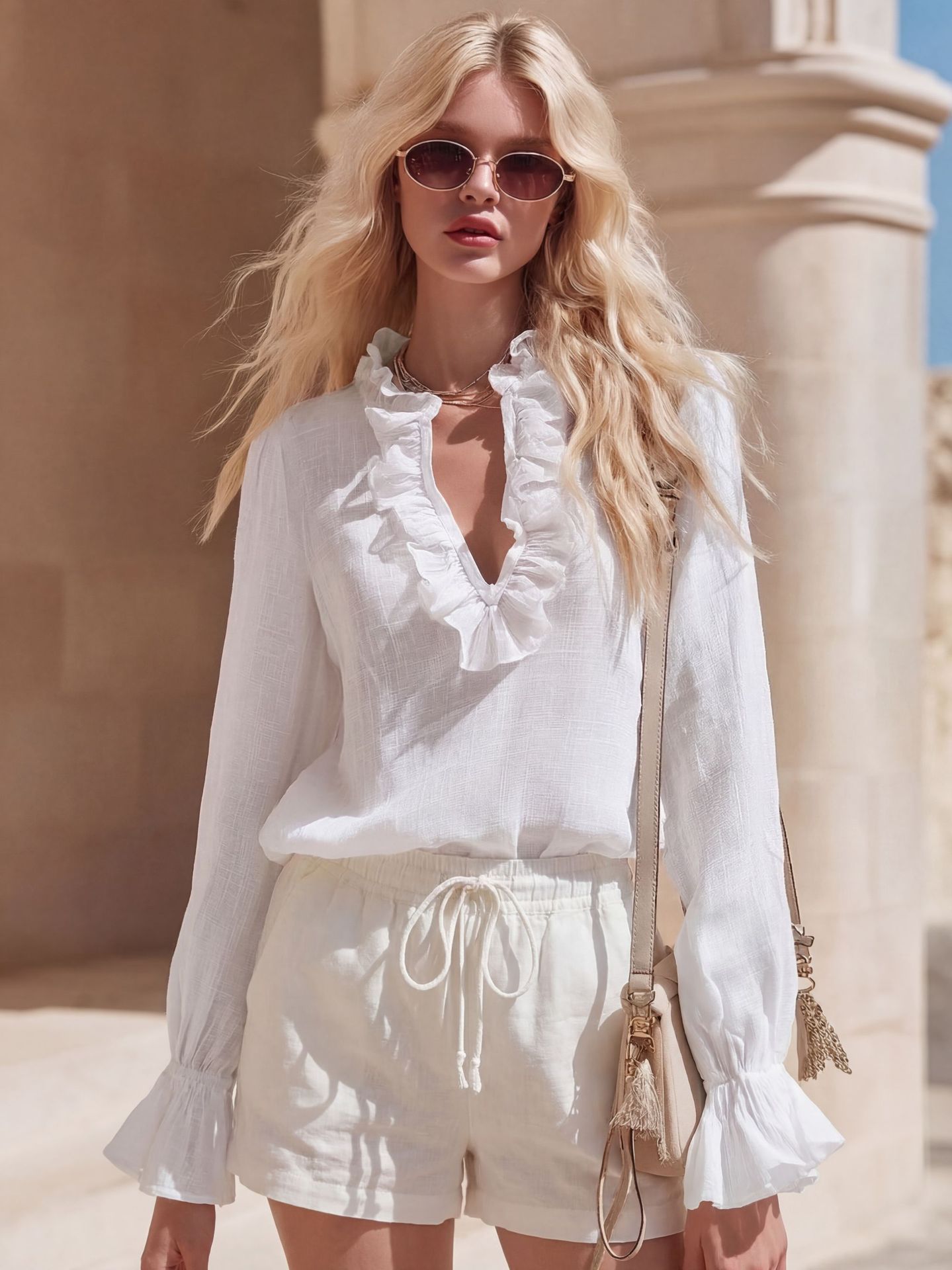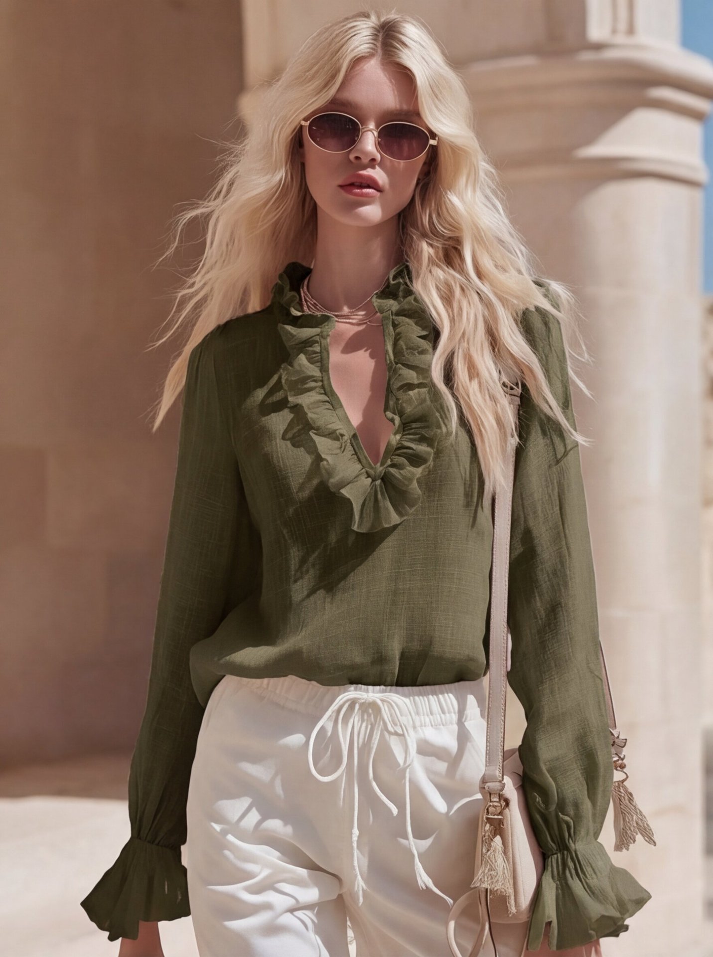 French Romantic Linen Ruffle-Trimmed V-Neck Shirt