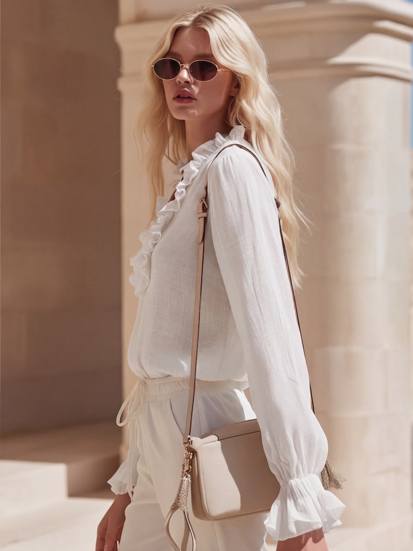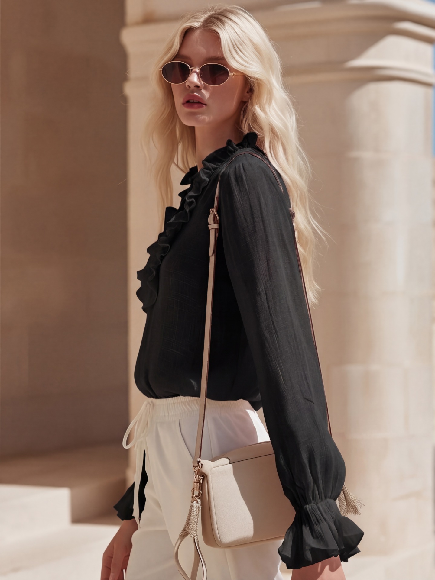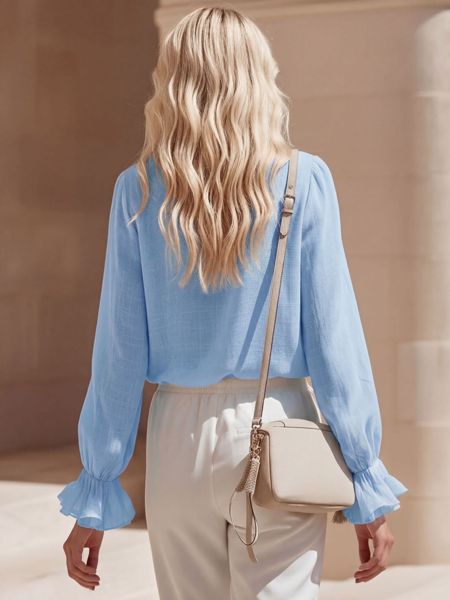 French Romantic Linen Ruffle-Trimmed V-Neck Shirt